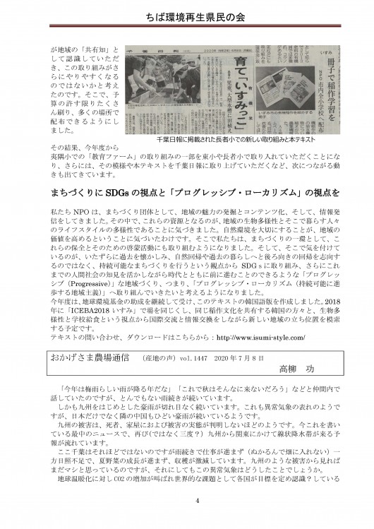 ちば環境再生県民の会が発行されている広報第41号で、地球環境基金の助成を受けて作成した生物多様性テキスト「いすみの田んぼと里山と生物多様性」について、取り上げていただきました。