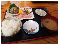 また、漁シーズンの時には、伊勢海老を使った料理も食べられます。身はさしみ、頭は味噌汁、半分は焼きで食べます。最近発売された、「伊勢海老天丼」はオススメです。 |